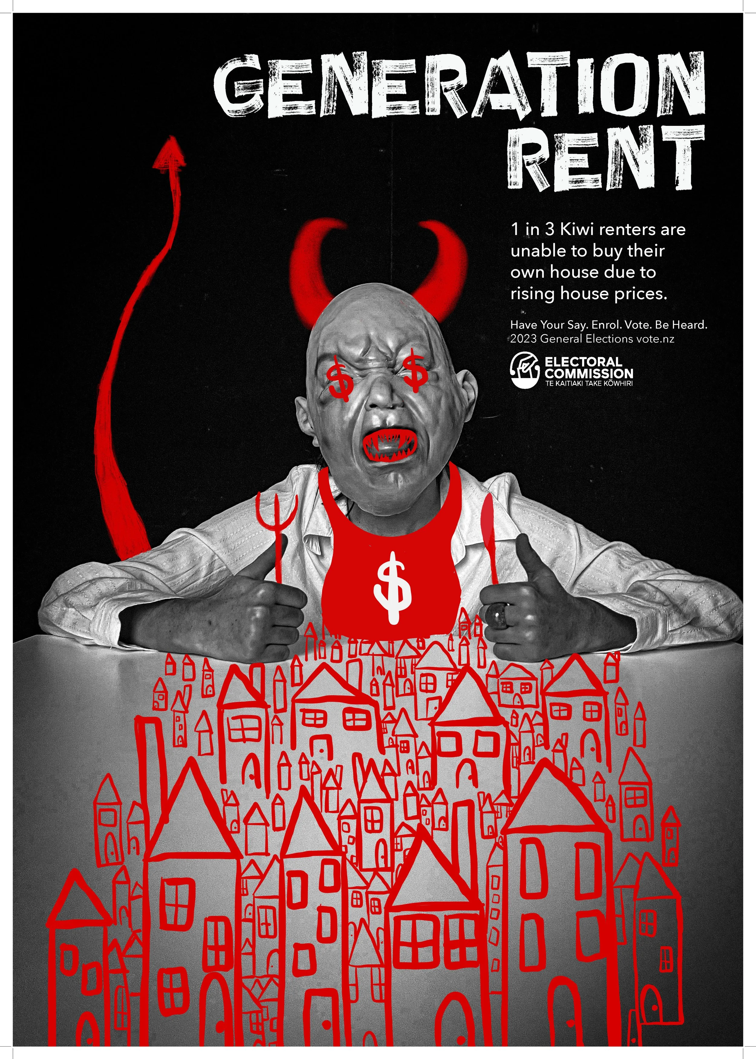 The Wehi of confrontation and shock is conveyed through merging the gun and key, as New Zealanders are not accustomed to firearms. The use of torn paper in the shape of a bullet hole rips back the shocking statistic, helping to emphasise the importance of this unsettling topic. The contrast of the red background on the blue image helps to highlight the merging gun and key, making it visually shocking. The varying hues of blue layered atop the graphically stylised image of the gun and key generate a deliberate juxtaposition between these two objects. This contrast emphasises the disparity that ideally shouldn’t coexist, yet in this metaphor, they do, intentionally amplifying the extent to which funding for housing has become a pressing issue. The bold text helps the metaphor sink in and creates a visual hierarchy that flows from the top of the gun to the bottom, tying the whole poster together.